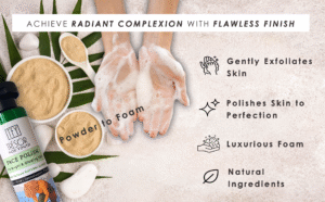Begin with wet hands and face. Pour ½ teaspoon of powder into hands and rub together. Gently massage onto face for 15 seconds, avoiding the eye area. Rinse with warm water.