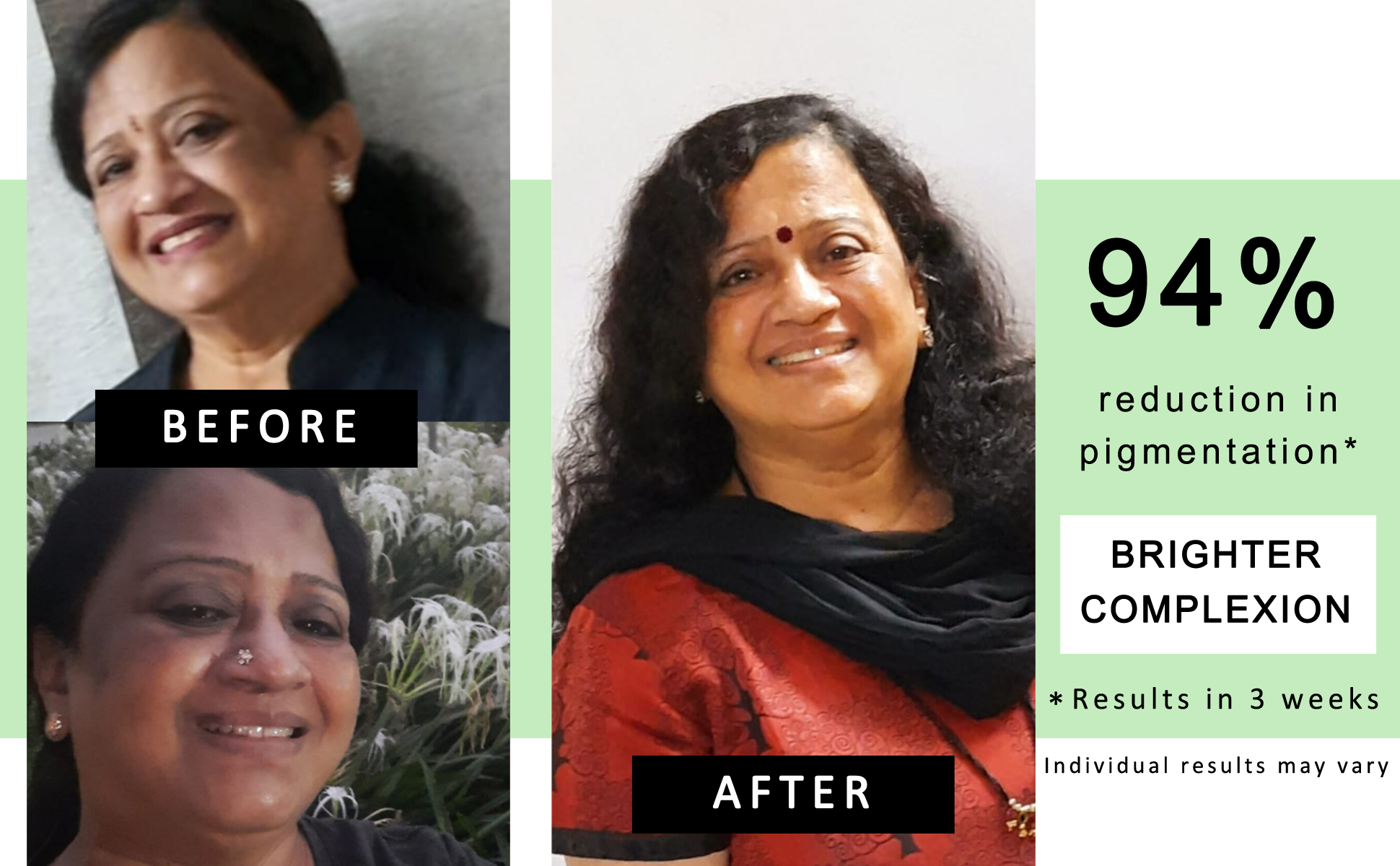 This is my 3rd bottle. Seeing a lot of improvement. I had pigmentation on my cheeks, but now it has reduced a lot.
